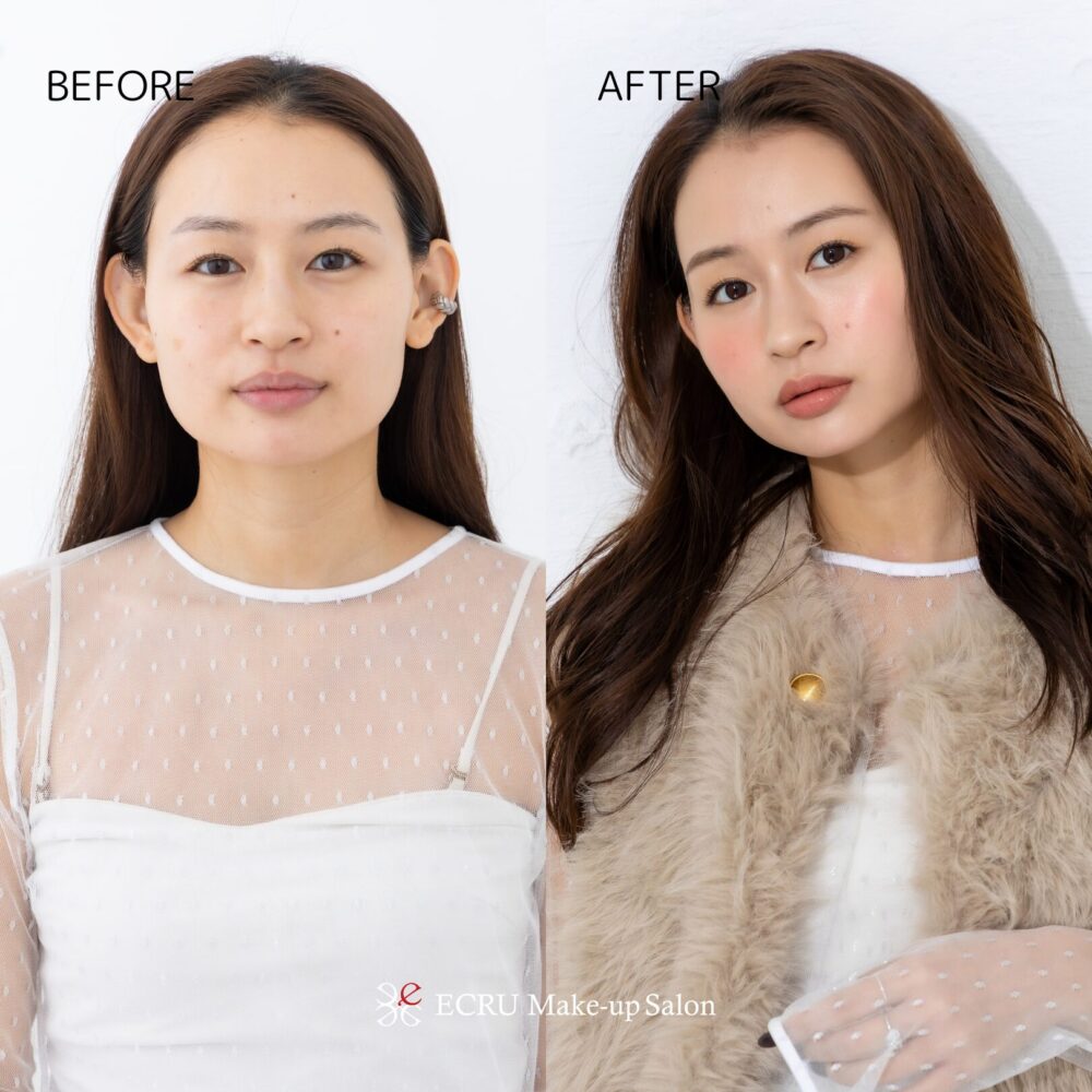 クリームチークで内側からじゅわっと血色感が出るように仕上げ、リップも色味を合わせました。